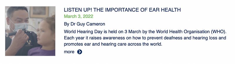 The Hunter Medical Research Institute featured a short article I wrote for world hearing day 2022 entitled: Listen up! The importance of ear health. Here I raise awareness that ear disease does not affect all Australian's equally, and describe how important verbal communication is to Indigenous culture.